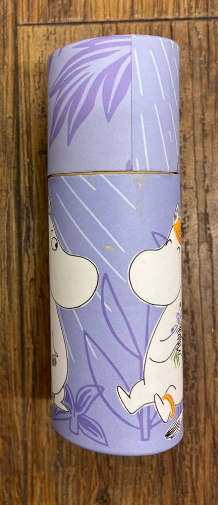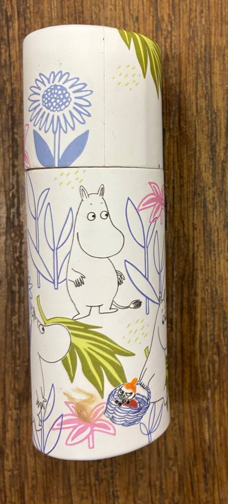 ムーミンの紙製の円柱ケースに入ったミニ色鉛筆セット12色。